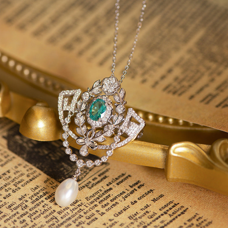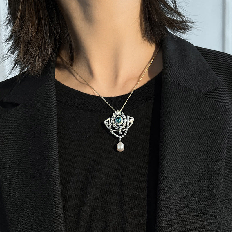Freshwater pearl teardrop lace blue diamond vintage brooch