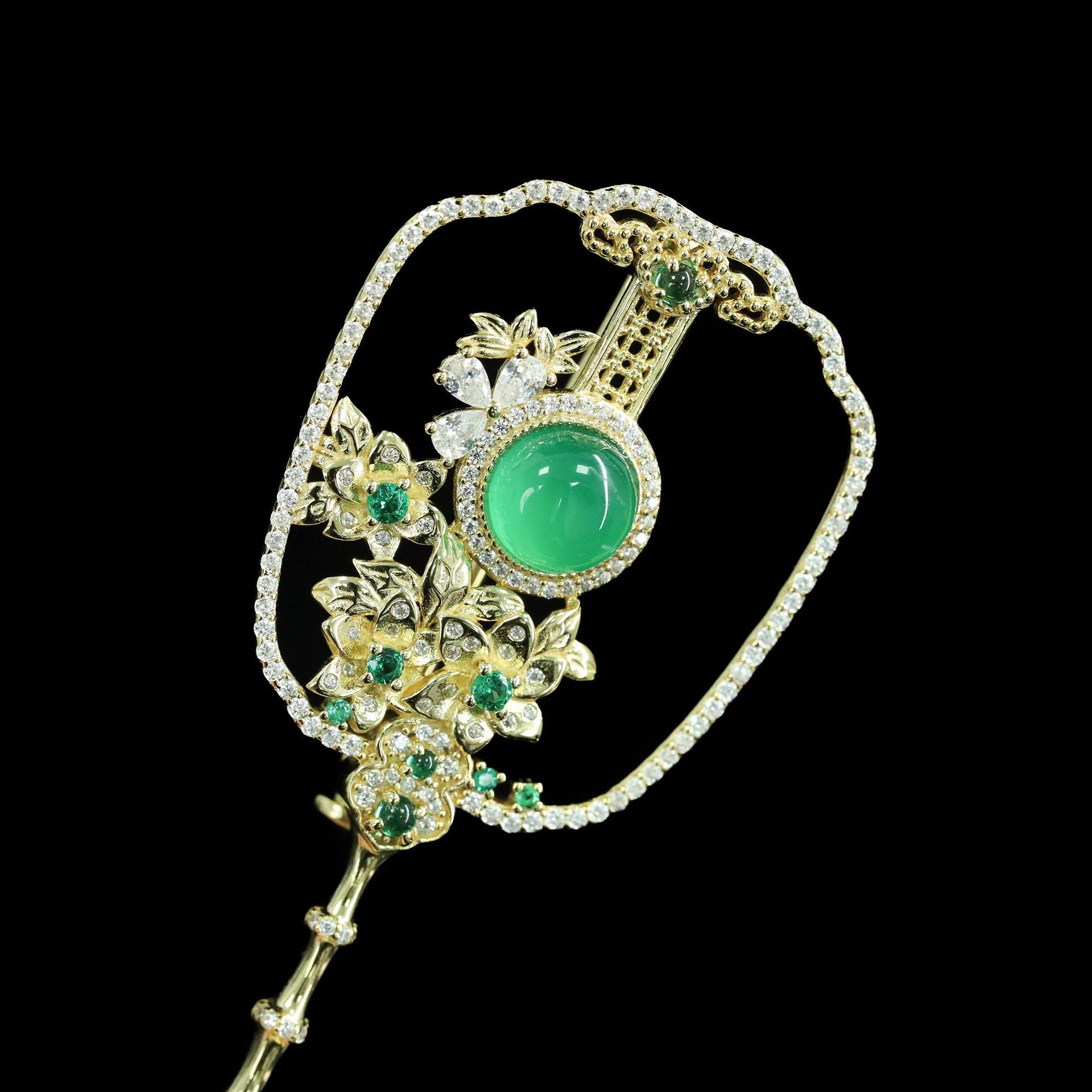 High Carbon Diamond Elegant Gold Natural Chalcedony Fan Brooch