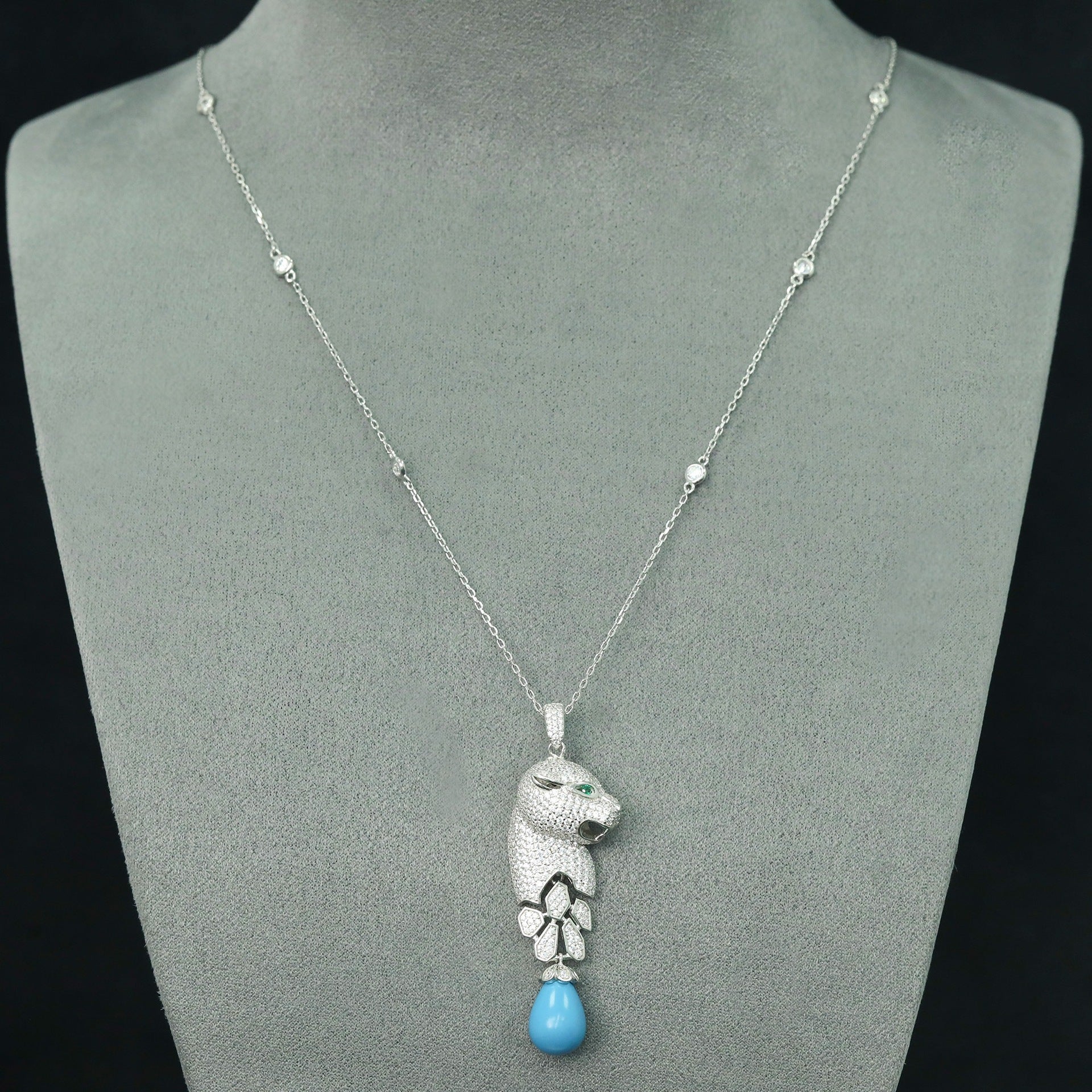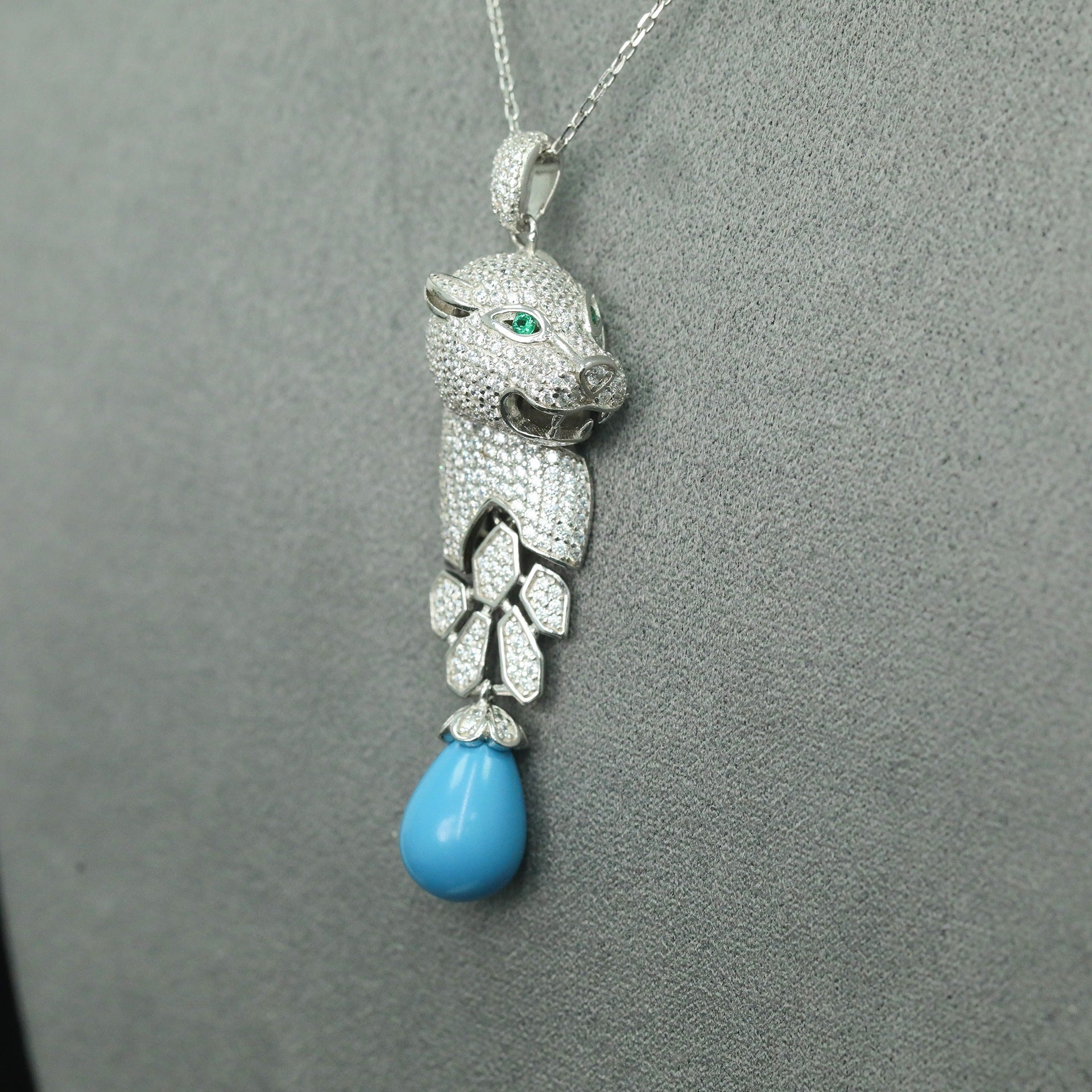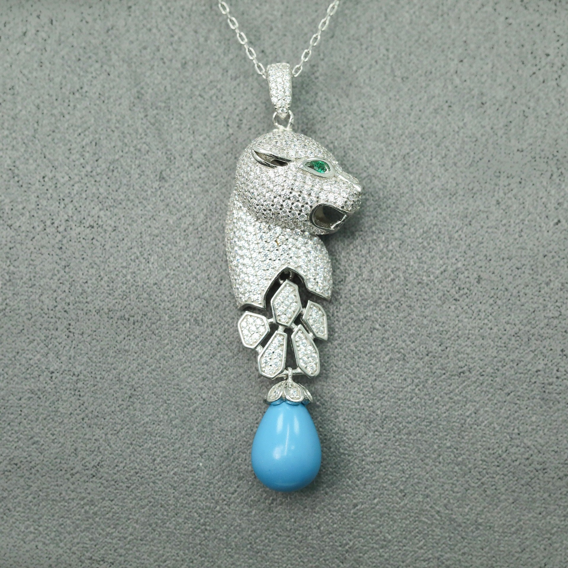 High Carbon Diamond Jaguar Blue Turquoise Pendant Silver Plated Necklace