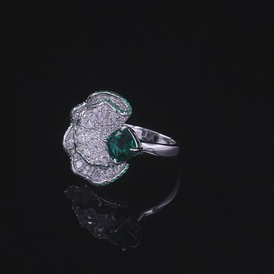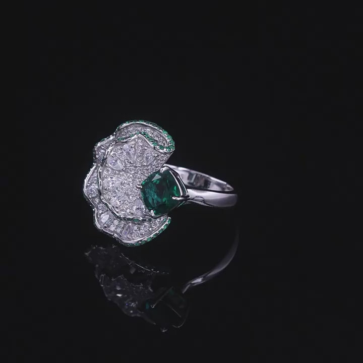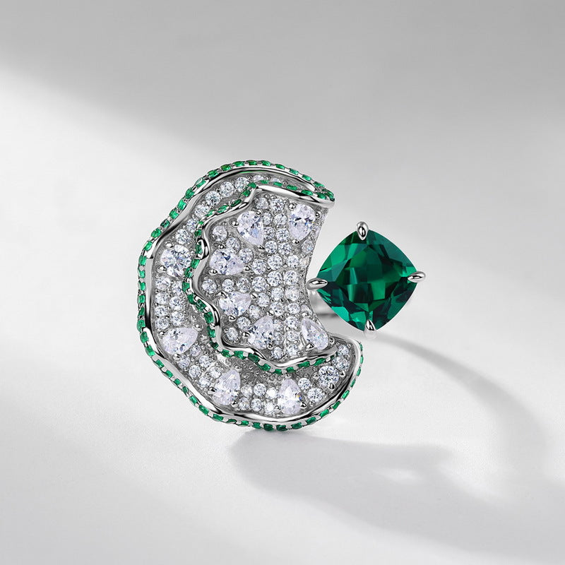 New Seiko full diamond petal ring women S925 sterling silver gold plated cultivated emerald ring