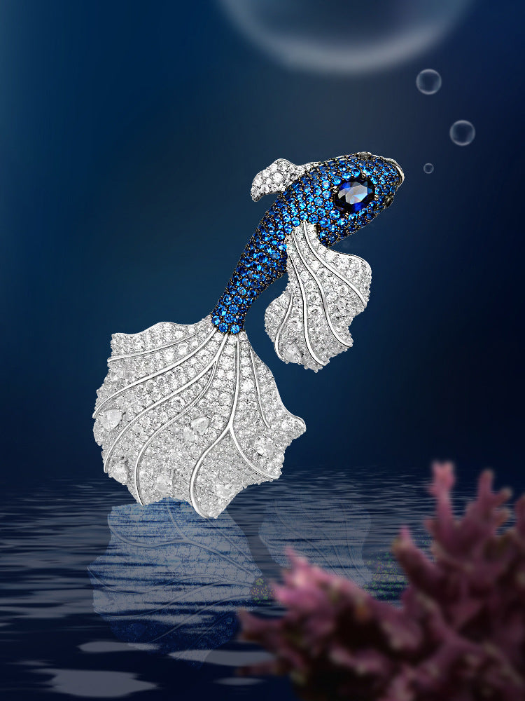 Royal Blue Oriental Aesthetics Golden Jade Goldfish Diamond Brooch