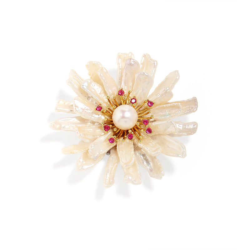 Shaped Pearl Daisy Gold Pink Diamond Stamen Brooch