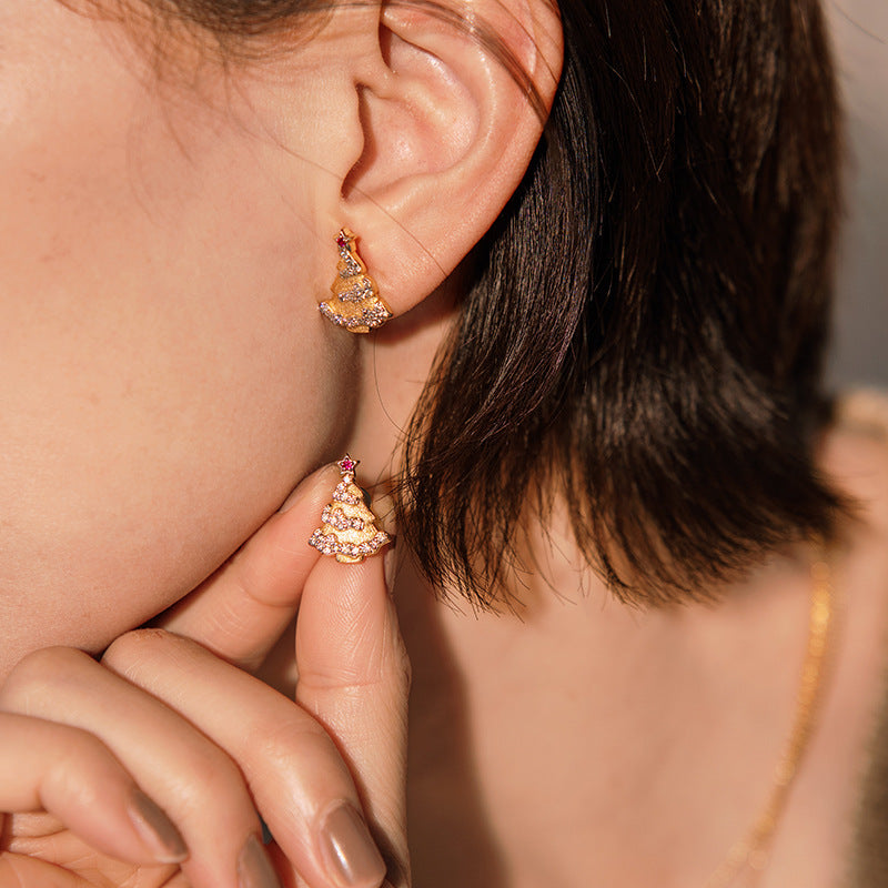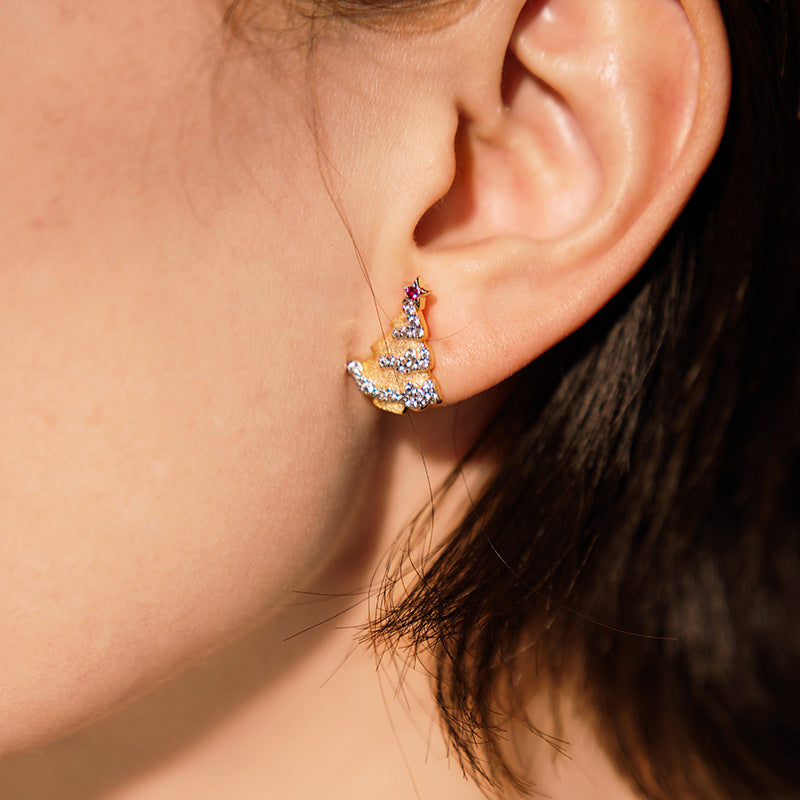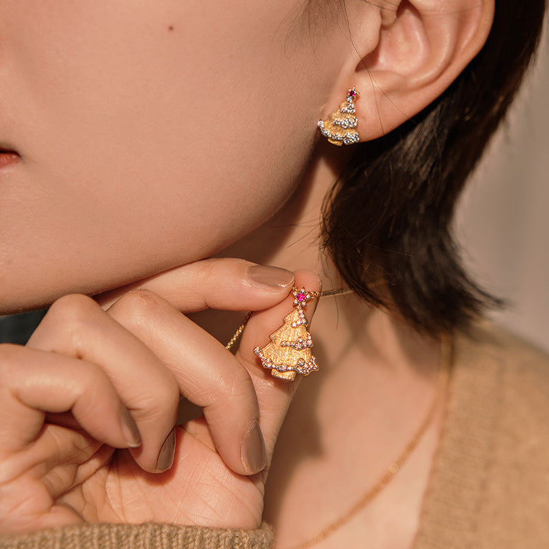 Sterling Silver Red Corundum Christmas Tree Brushed Earrings